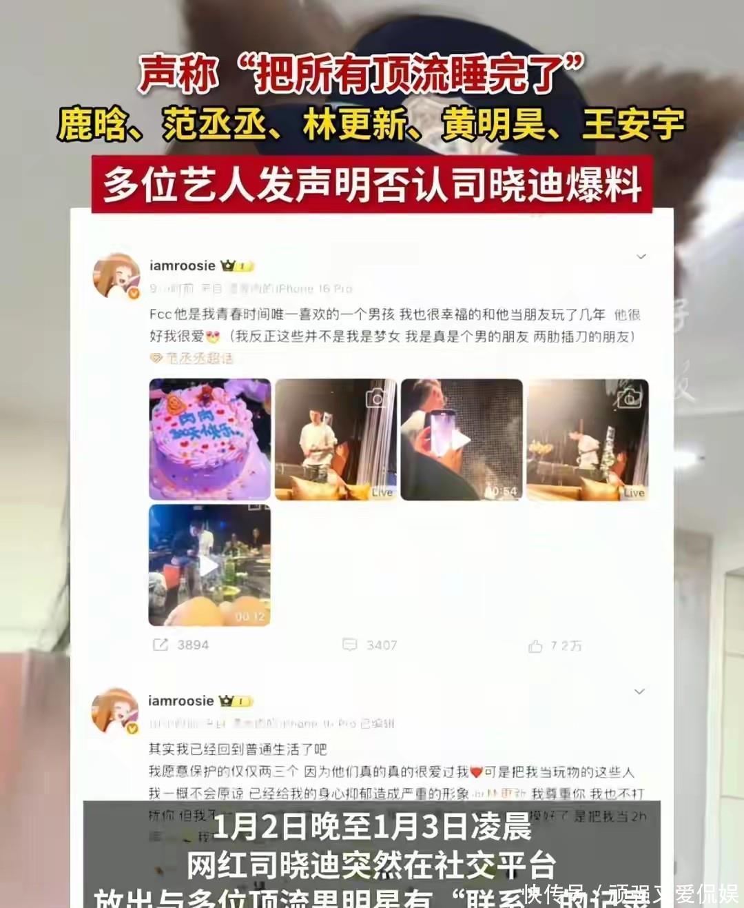 1月2日深夜至3日凌晨,网红司晓迪在社交平台及粉丝群连续发布多条内容,以“30岁已接触多位顶流艺人”为表述,提及鹿晗、范丞丞、林更新、蔡徐坤、黄明昊、张一山、王安宇、檀健次等十余名男艺人,声称与他们存在关联,并附上聊天记录、照片、语音等所谓“相关材料”。